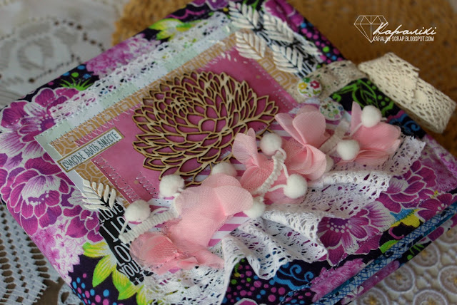Итак, моя хорошая подруга попросила меня сделать альбом с пустыми листами. Для создания такого альбома я использовала ткань Daily like, конечно же, кружево и бумагу с чипбордом Каралики.